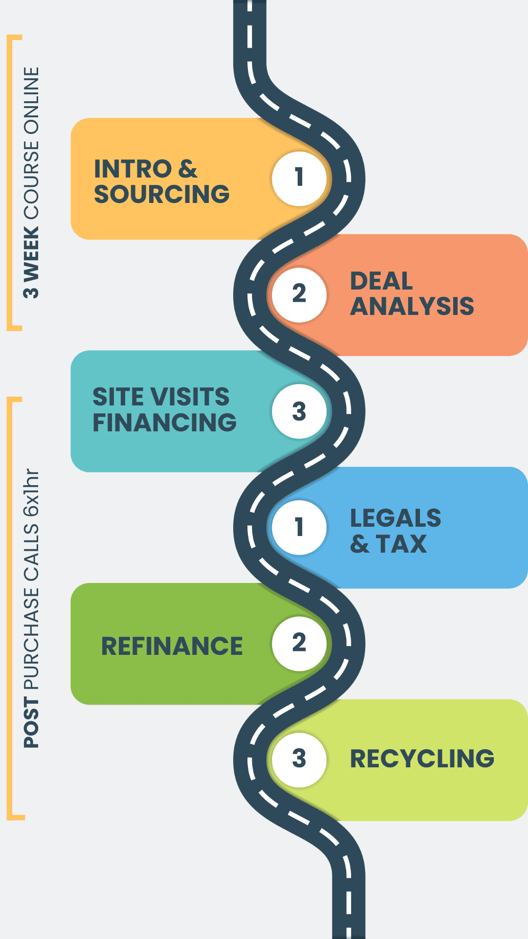 The programme begins with an intensive three-week learning phase to build strategic and technical understanding. This is followed by six one-hour 1:1 sessions scheduled around the purchase of your block, providing focused guidance at key stages of the transaction.